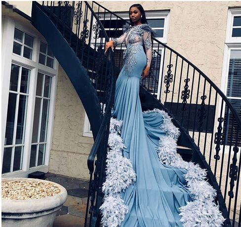 2019 Gorgeous Feather Mermaid Prom Dress Jewel Neck Illusion Lace Applique with Feather Long Sleeve African Sexy Court Train Evening Dresses