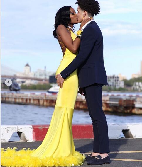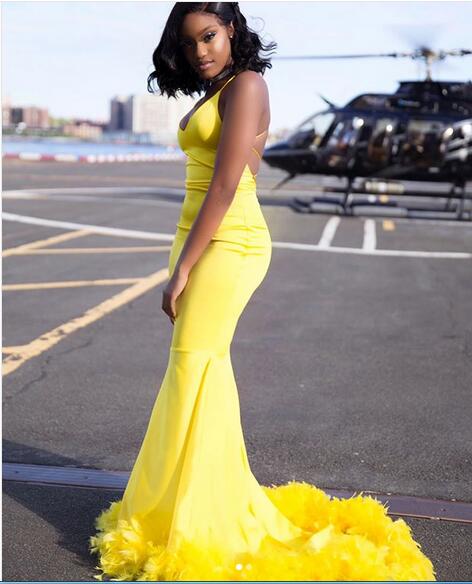 Yellow Mermaid Prom Dresses Backless African Girl Black Girl Feathers Evening Formal Gowns