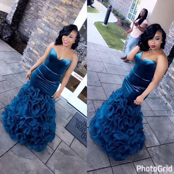 Blue Mermaid Velvet Prom Dresses Sweetheart Tiered African Girl Black Girl Evening Formal Gowns