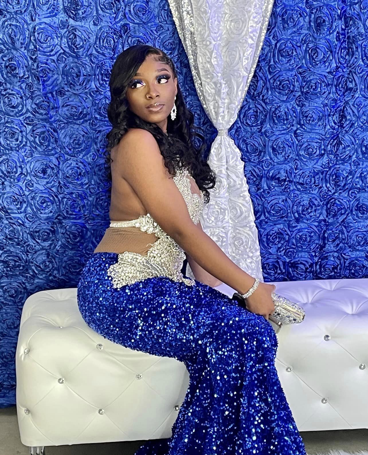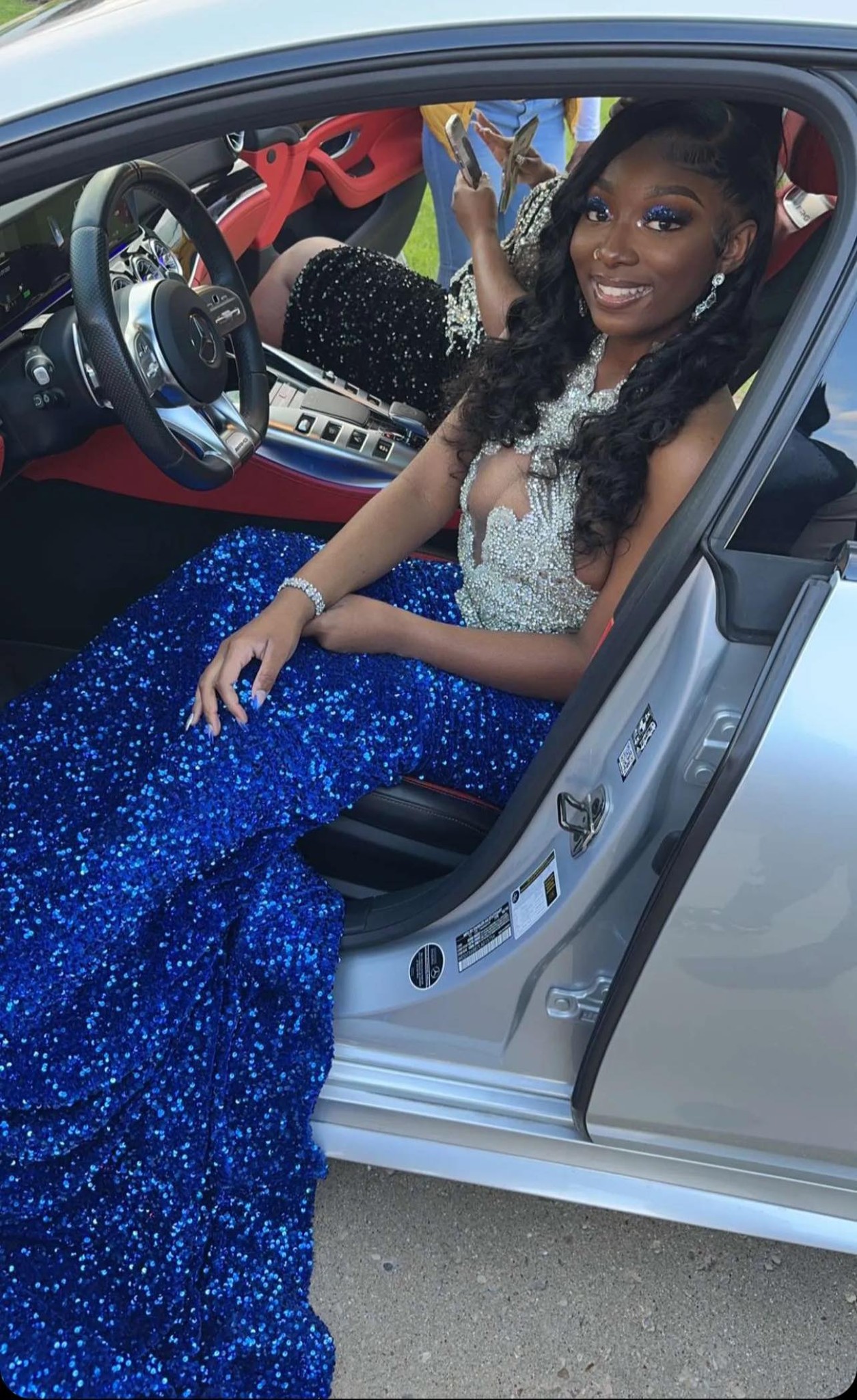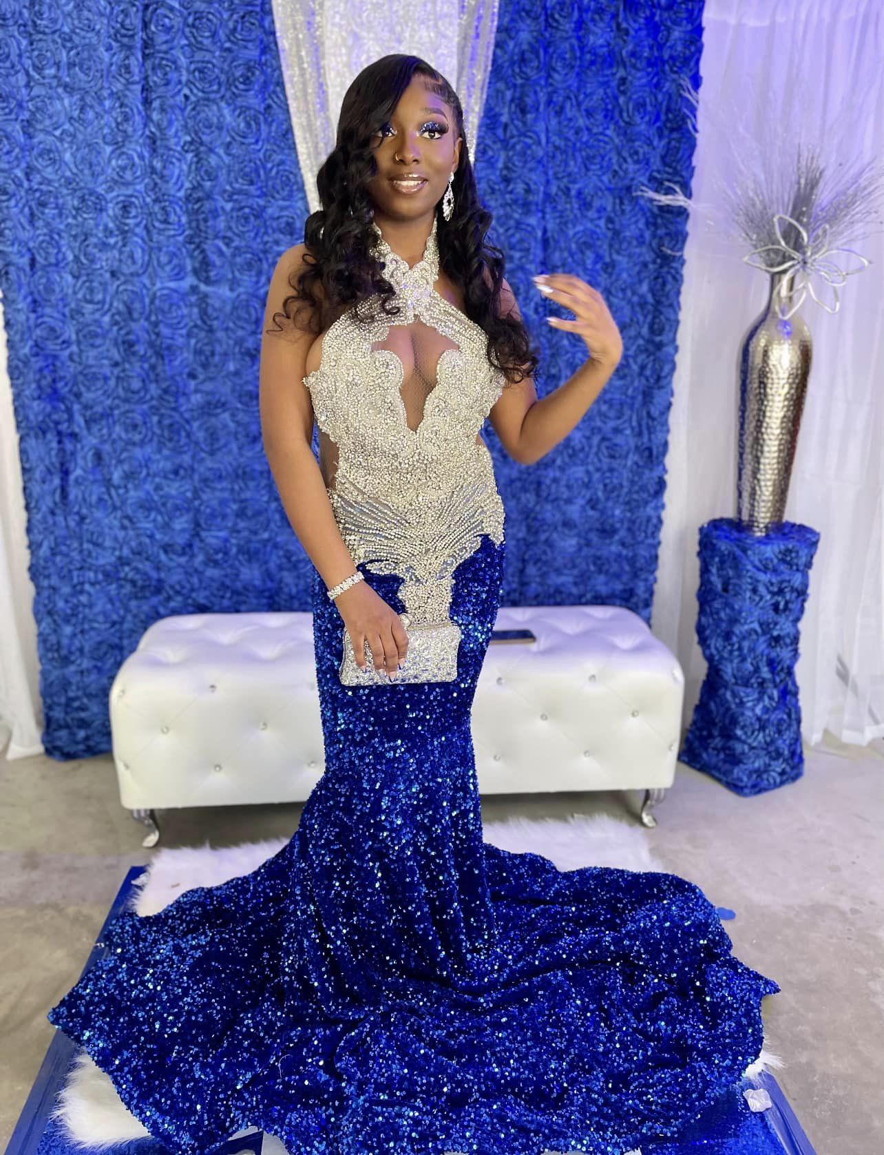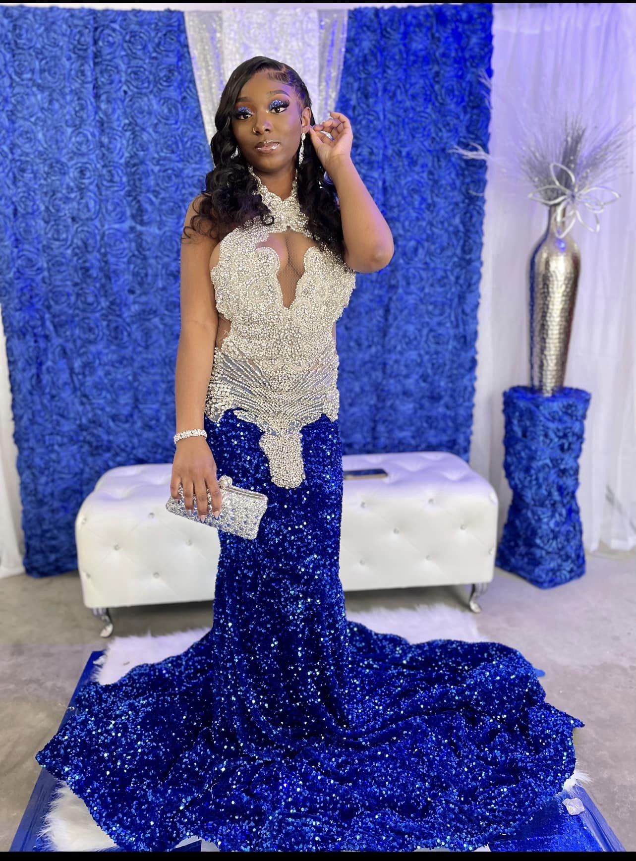 Royal Blue Sequins Lace Beading Crystals African Prom Dress Black Girl Evening Dress