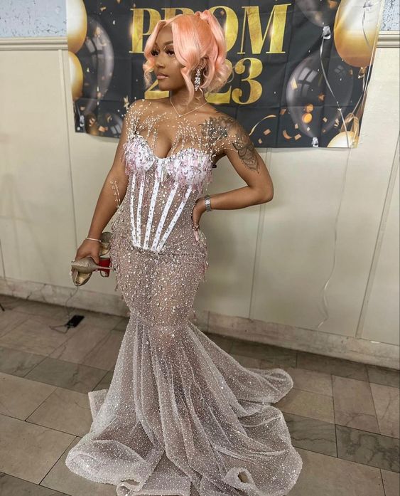 Sliver Sexy Sequins Lace African Prom Dress Evening Dress
