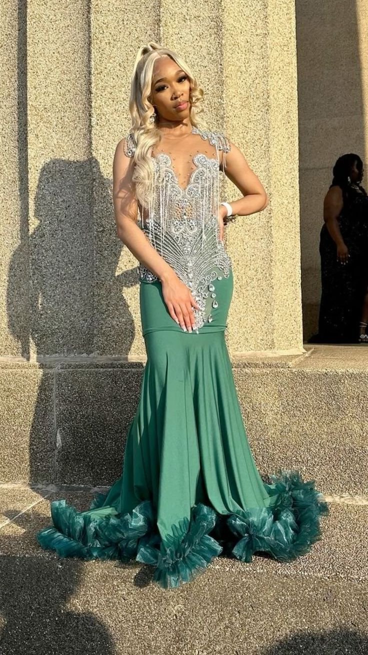 African Girls Sheath Green Beading Crystals Prom Dress Formal Evening Dresses