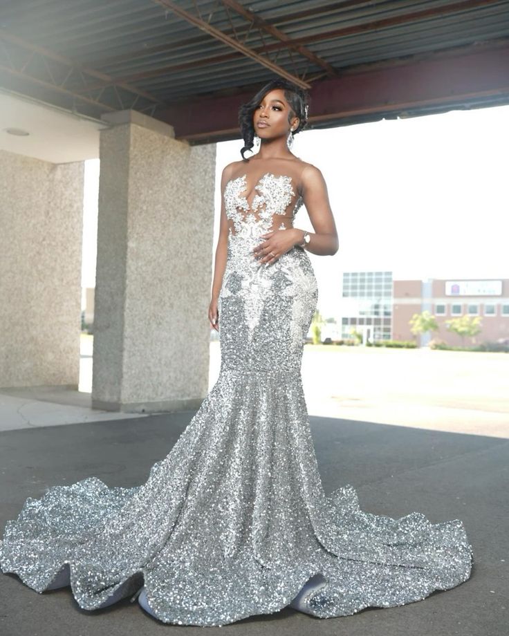 African Girls Sliver Mermaid White Appliques Prom Dress Formal Evening Dresses