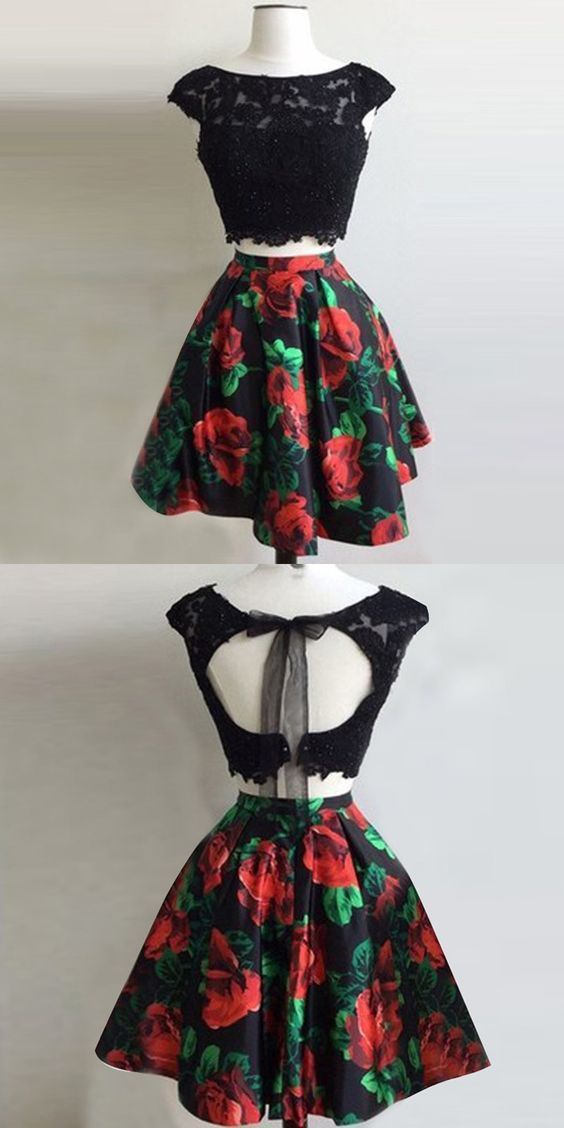 Two Piece Bateau Open Back Short Black Floral Homecoming Dress with Appliques