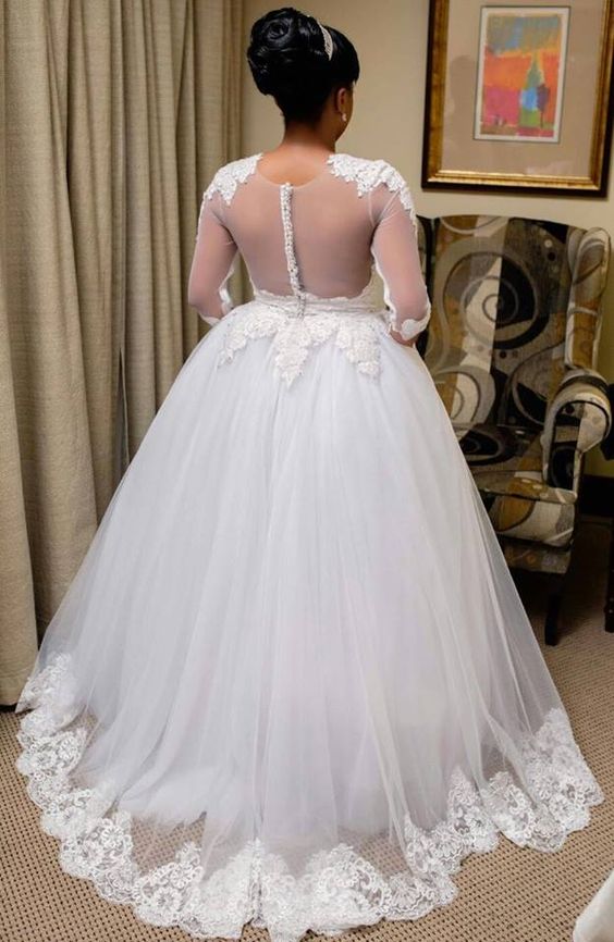 Ball Gown Tulle Wedding Dresses Crew Neck Sheer Half Sleeve Lace Appliques South African Girl Bridal Gowns