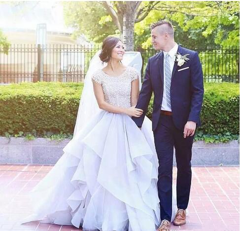 Charming A Line Wedding Dresses Sparkly Beading Top Organza Ruffles Bridal Dresses Short Sleeves Wedding Gowns