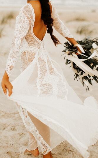 Long Sleeve Ivory Lace Wedding Dresses See Through Backless Boho Wedding Dresses