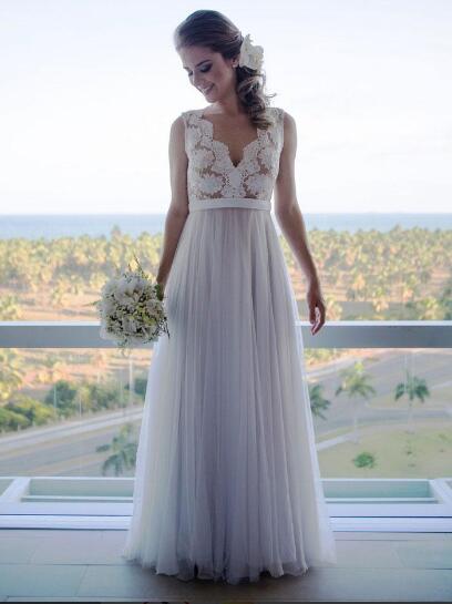 A-line V-neck Vintage Lace Top Tulle Skirt Beach Wedding Dresses