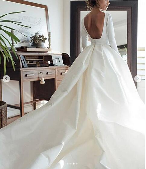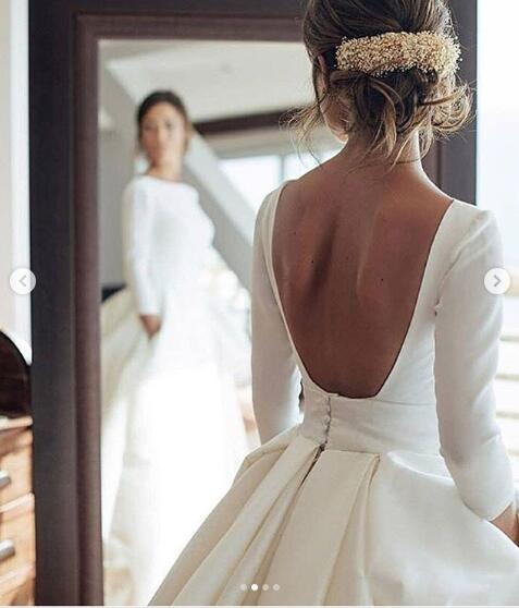 Simple A Line Satin Wedding Dresses Beautiful Backless Crew Neck Covered Button Bridal Gowns