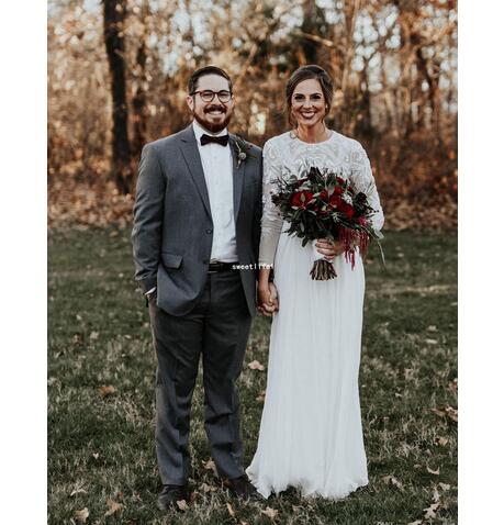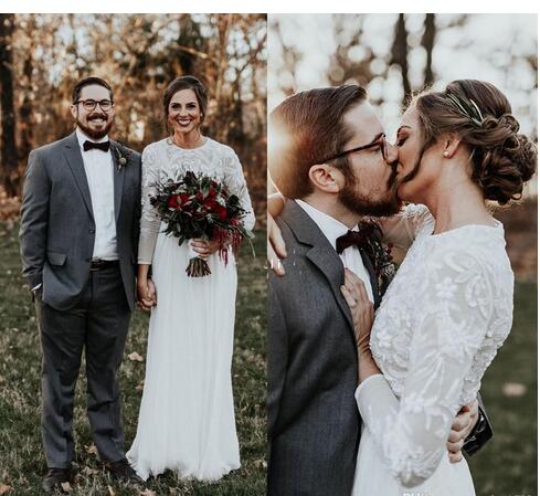 Modest Bohemian Lace Wedding Dresses A Line Long Sleeve Cheap Chiffon Garden Bridal Gown Lace Appliques Custom Wedding Bridal Gowns