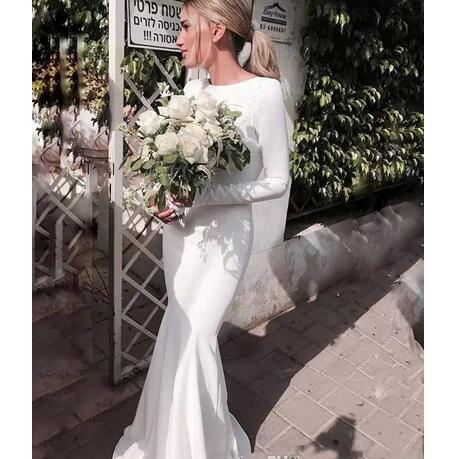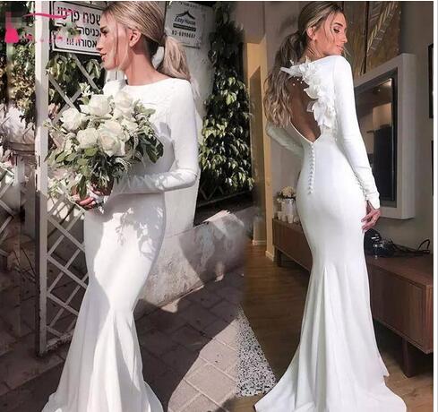 Long Sleeve Satin Wedding Dresses Mermaid Jewel Neck Bohemian Open Back Vestido De Noiva with 3D Flowers Long Wedding Dresses