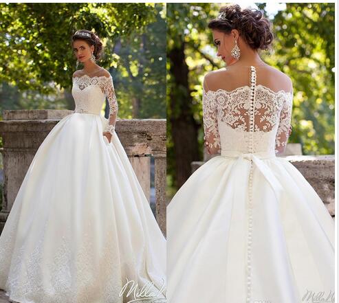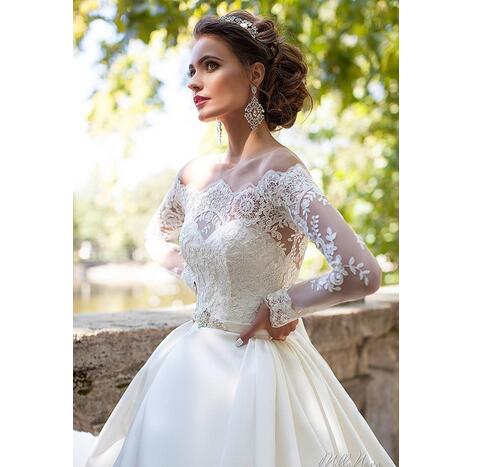 Long Sleeves Wedding Dresses Sheer Neckline Appliques Sweep Train Satin Vintage Country Bridal Gowns Vestidos De Noiva
