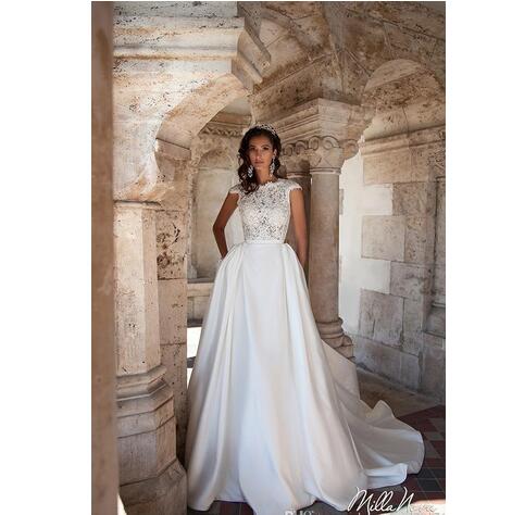 Illusion Cap Sleeves Lace A Line Wedding Dresses Satin Illusion Tulle Applique Backless Court Train Bridal Gowns