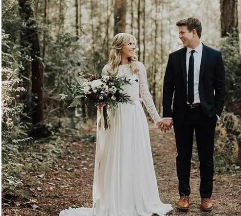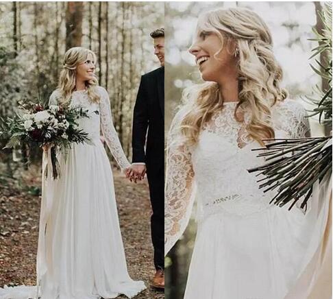 Vintage Country Style Spring Wedding Dresses Bridal Gowns Chiffon Garden Bohemian Illusion Lace Backless Long Sleeves Bridal Gowns