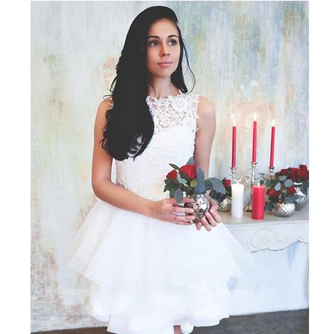 Elegant White Lace Wedding Dresses Jewel Neck Lace Appliques Summer Civil Hippie Bridal Dresses Knee Length Organza Ruffles Wedding Gowns