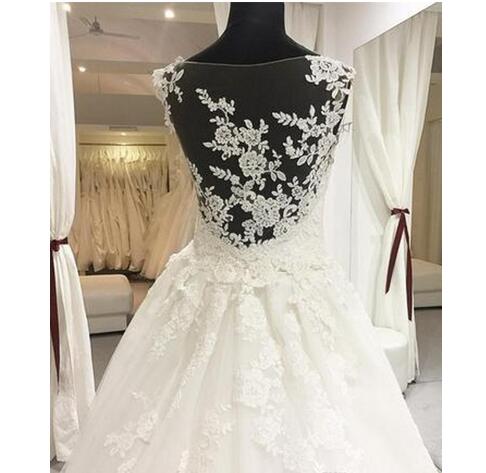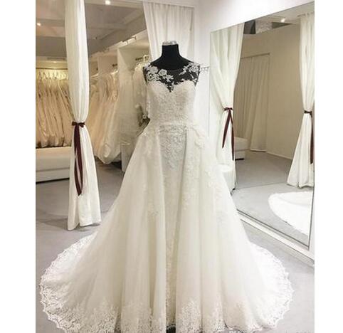Fresh Illusion Bodice Wedding Dresses Elegant Sheer Lace Appliques Neckline Court Train Princess Backless Mopping Long Section Wedding Gowns