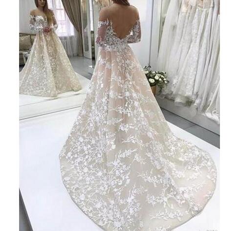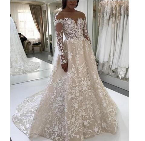 Charming Luxury Wedding Dresses Ivory Lace Embroidery Nude Tulle Neckline Long Sleeves Champagne Court Train Wedding Gowns
