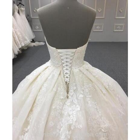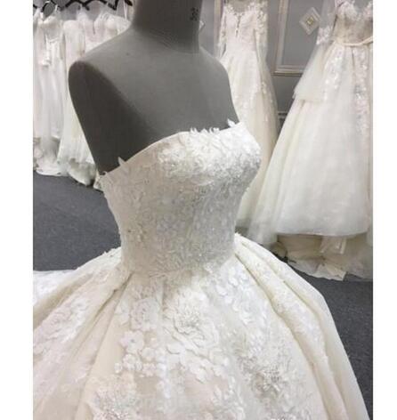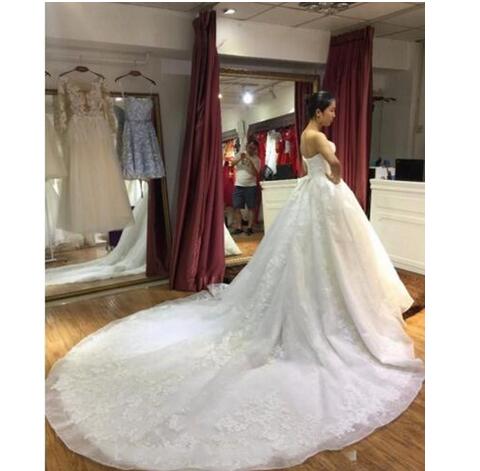 Hight Quality Elegant A Line Wedding Dresses Straepless Sleeveless Applique Cathedral Train Tulle Lace Up Wedding Gowns