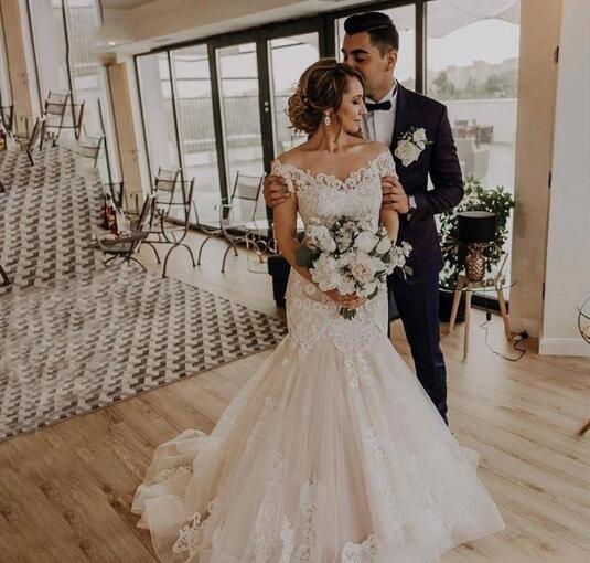 Elegant Short Sleeves Lace Mermaid Wedding Dresses with Appliques Off Shoulder Sweep Train Tulle Wedding Dress Bridal Gowns
