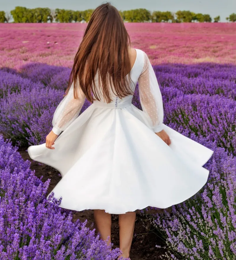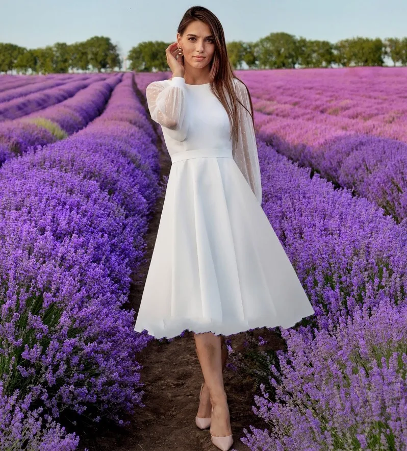 Elegant Short Wedding Dress Lace Tulle Modest Long Sleeve Scoop Bohemian Beach Garden Bridal Party Gowns