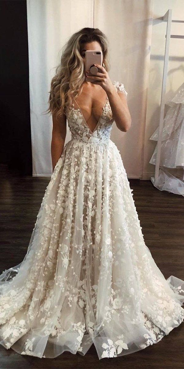 Sexy Deep V-neck Flowers Appliques Wedding Dress, Luxury Sparkle Floral Wedding Gown