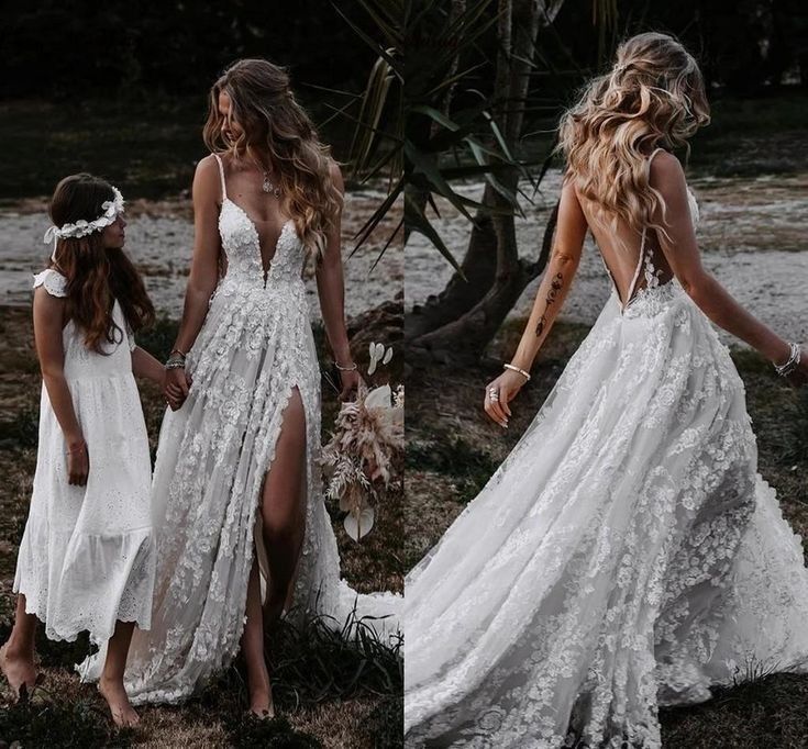 Boho Sexy Deep V-neck Flowers Appliques Wedding Dress, Backless Floral Wedding Gown