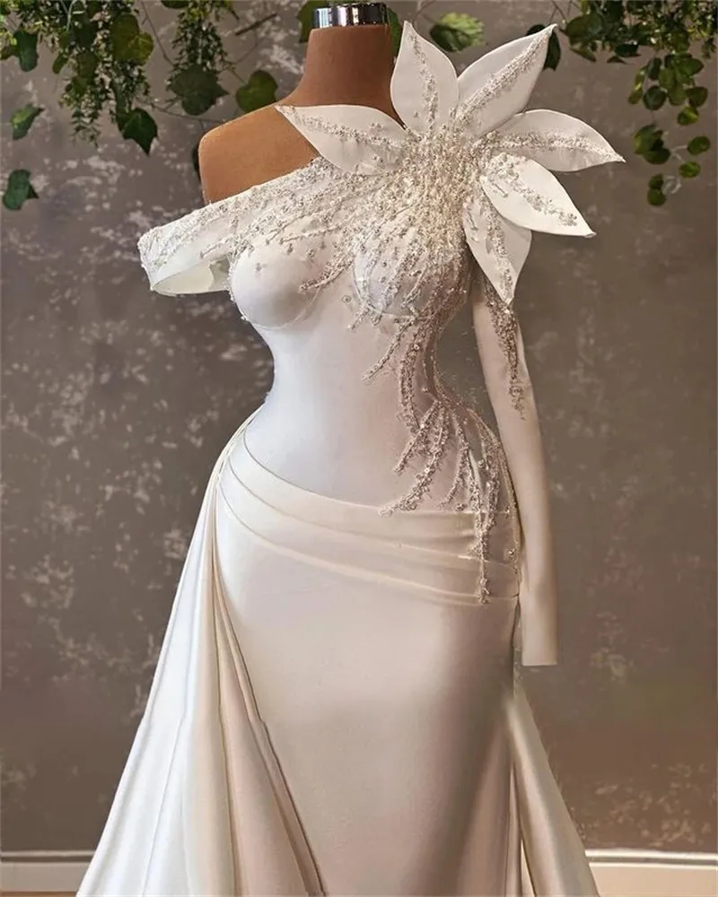 Mermaid Wedding Dress for African Brides Sexy Slim-Fit Beaded Big Flower Bridal Gown with Detachable Train robe de mariee Satin Boho Wedding dress