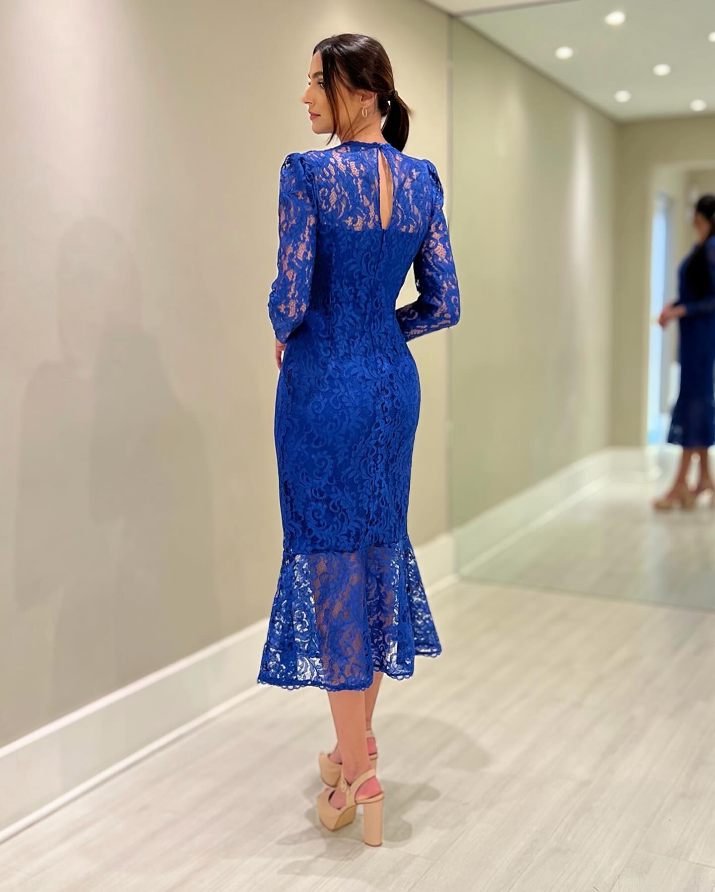 Elegant Royal blue lace Mother Of The Bride Dresses jewel long sleeves Wedding Guest Dress tea length mermaid Evening Gowns