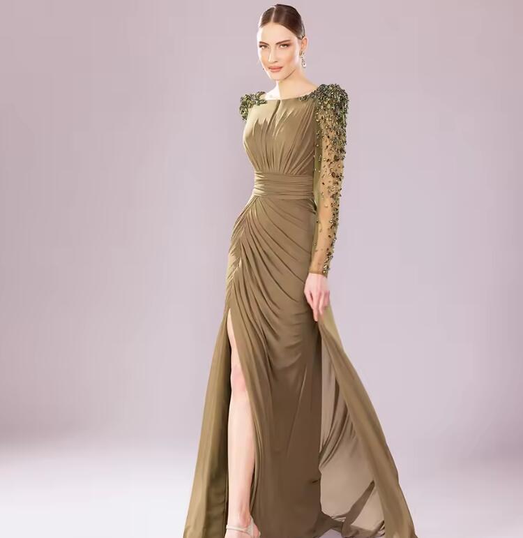 Luxury Wedding Party Dress Crystal Long Sleeves Column Formal Evening Gowns Green Chiffon Side Split Mother of the Bride Dresses