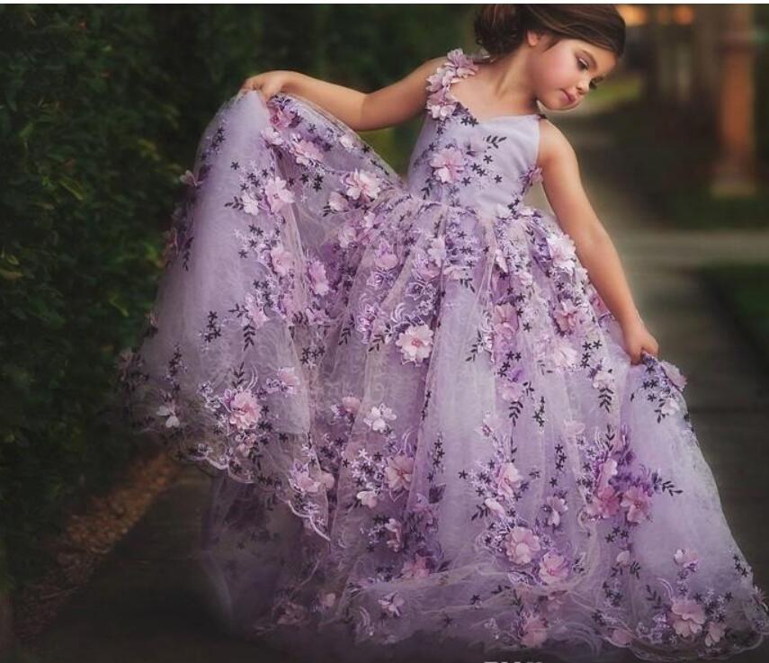Lavender Lace Little Girls Pageant Dresses 3D Appliques Toddler Ball Gown Flower Girl Dress Floor Length Tulle First Communion Gowns