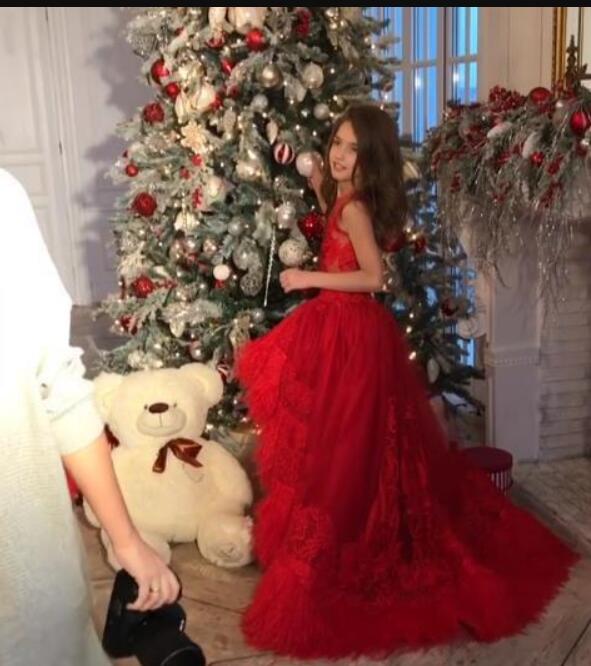 Red Feather Girls Pageant Dresses Jewel Neck Appliqued High Low Toddler Flower Girl Dress Lace Tulle First Communion Gowns