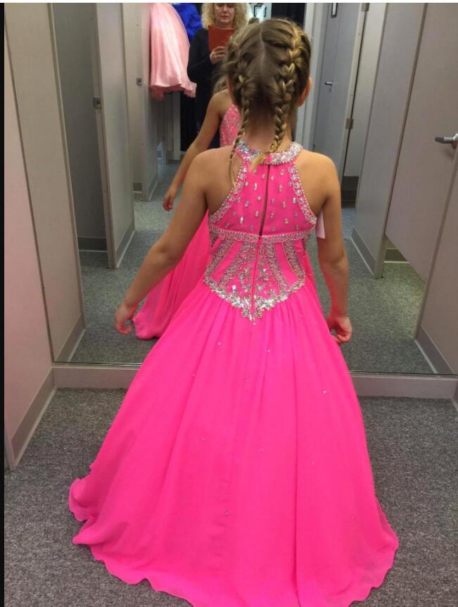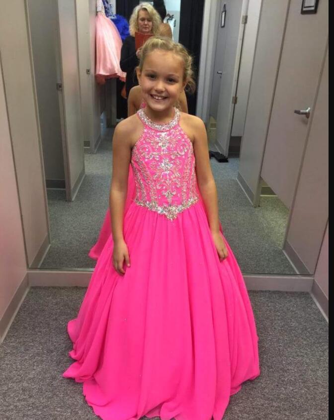 Lovely Fuchsia Beaded Crystals Girls Pageant Dresses A Line Halter Neck Kids Celebrity Evening Prom Party Gowns Custom Made