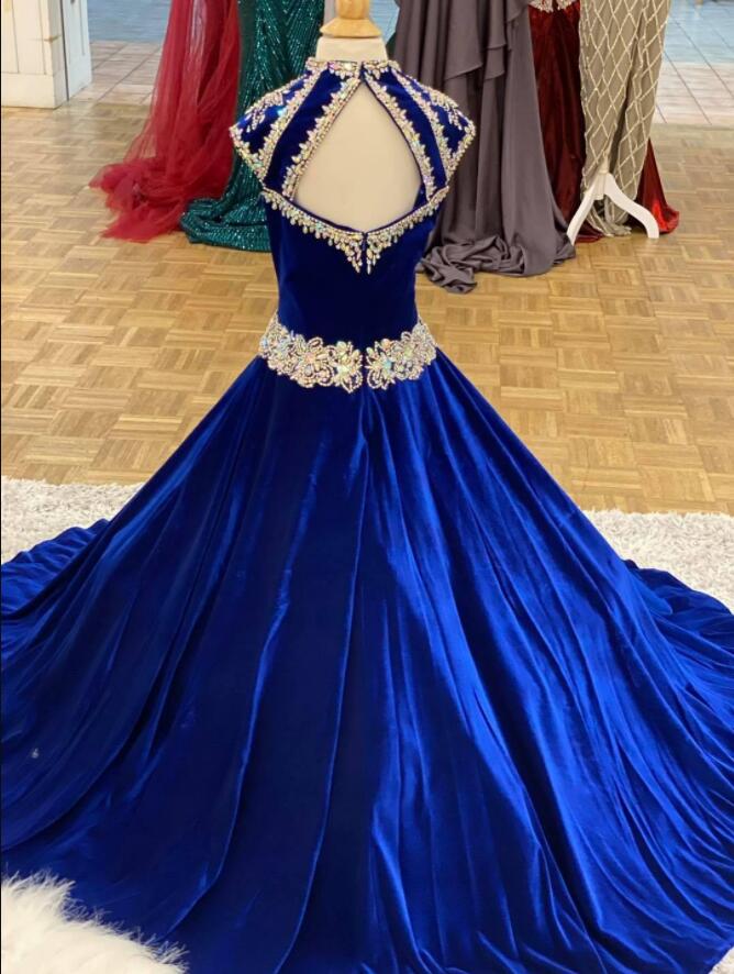 Fashion Royal-Blue Velvet Pageant Dresses for Infant Toddlers Teens Cap Sleeve ritzee roise Ball Gown Long Little Girl Formal Party Gown