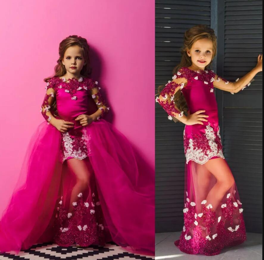 Bling Girls Pageant Dresses Fuchsia Long Sleeves Lace Crystal Beaded With Flowers Flower Girl Dresses Kids Wear Birthday Communion Dress Overskirts