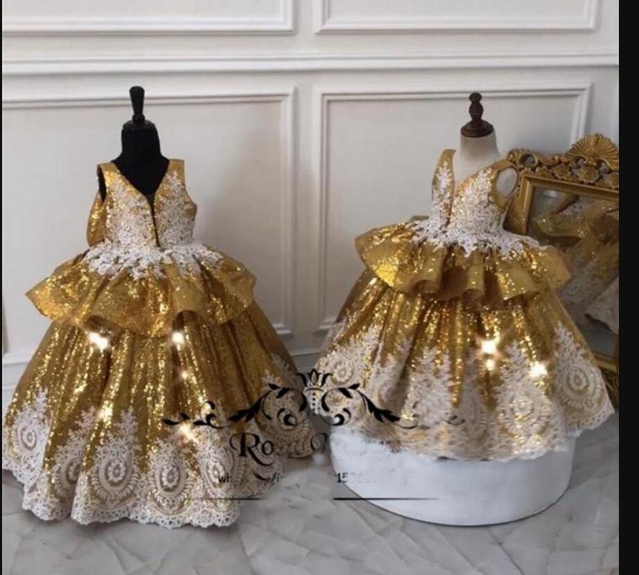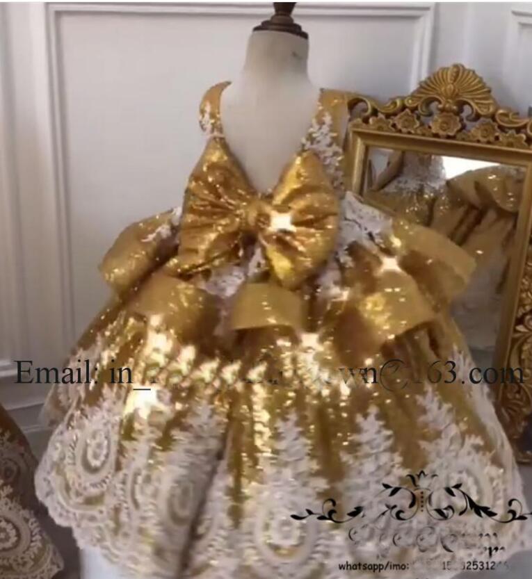 Gold Sequined Ball Gown Girls Pageant Dress 2022 Vintage Lace Ruffles Bow Plus Size Toddlers Kids Dresses Party Dresses