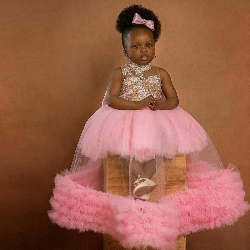 Pink Ball Gown Flower Girl Dresses for Wedding See Thro Beaded Puffy Little Girls Pageant Dress Toddler First Communion Gowns