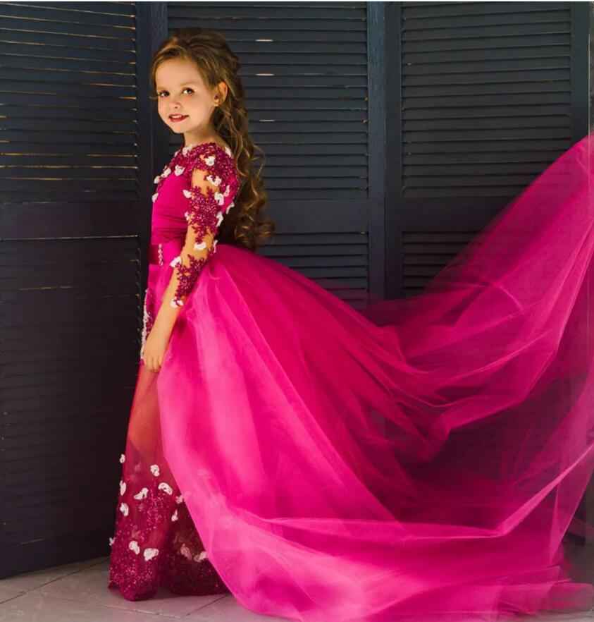 Bling Girls Pageant Dresses Fuchsia Long Sleeves Lace Crystal Beaded With Flowers Flower Girl Dresses Kids Wear Birthday Communion Dress Overskirts