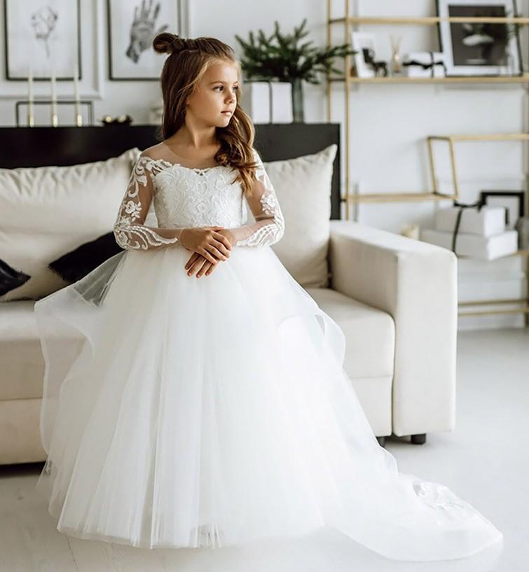 Princess White Flower Girl Dresses Sheer Long Sleeve Appliques A Line Girl Pageant Dresses Little Baby Kids Gowns For Birthday First Communions