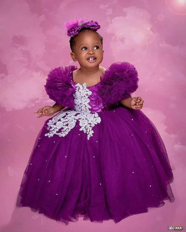Purple Lace Crystals Flower Girl Dresses Ball Gown Tulle Elegant Lilttle Kids Birthday Pageant Weddding Gowns