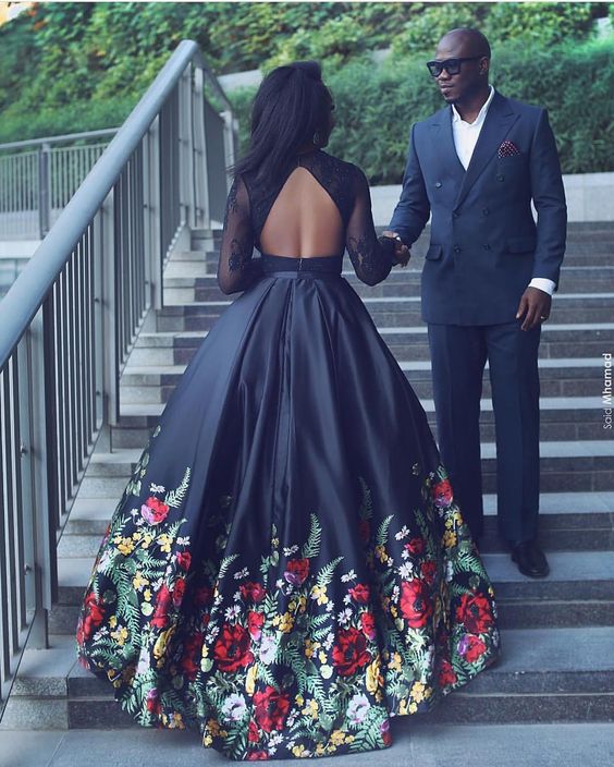 Floral Print Ball Gown Prom Dresses Two Pieces Sheer Long Sleeve Lace Black Girl African Girl Evening Formal Gowns