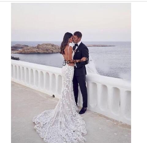 Wedding Dresses V-neck 3D Lace Applique Sweep Trumpet 2020 Sexy Backless Mermaid BeachGarden Bridal Wedding Dress