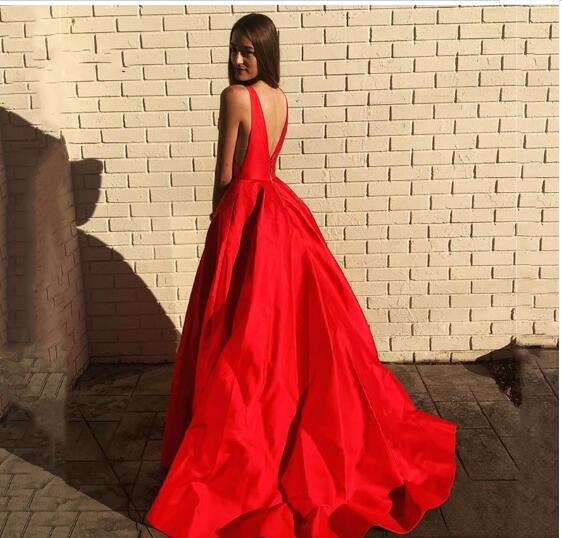 Red Satin Ball Gown Formal Prom Dresses backless Illusion V-neck Back Party Evening Dress with Pockets vestido