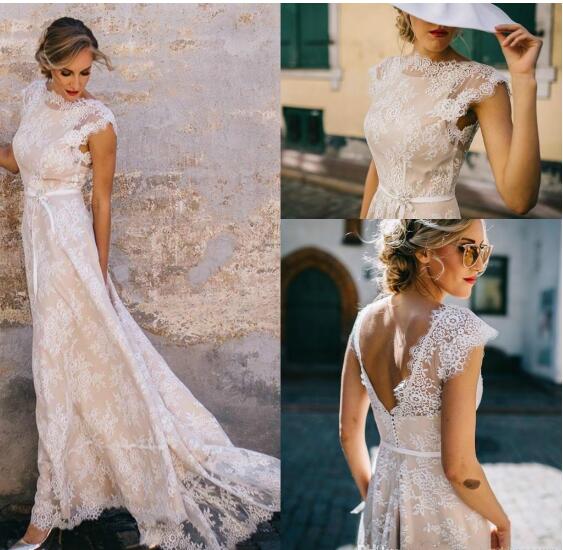 Vintage Champagne Lace Bohemian Wedding Dress A Line Cap Sleeve Soft Tulle Bow Sash Wedding Bridal Gown