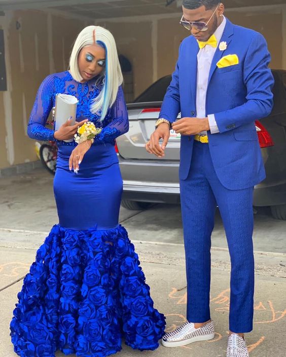 Royal Blue Mermaid Prom Dresses Lace Appliques 3D Handmade Flower Long Sleeve Evening Party Formal Gowns