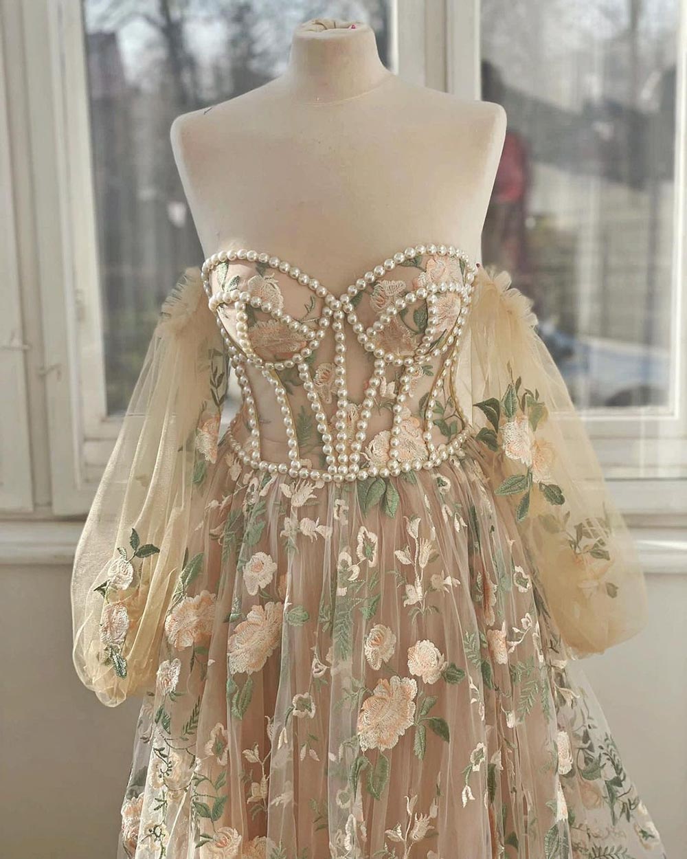 Exquisite Long tulle Prom Dresses Embroidery Pearls Lace Appliques Puff Sleeves Sweetheart A-Line Formal Party Dress