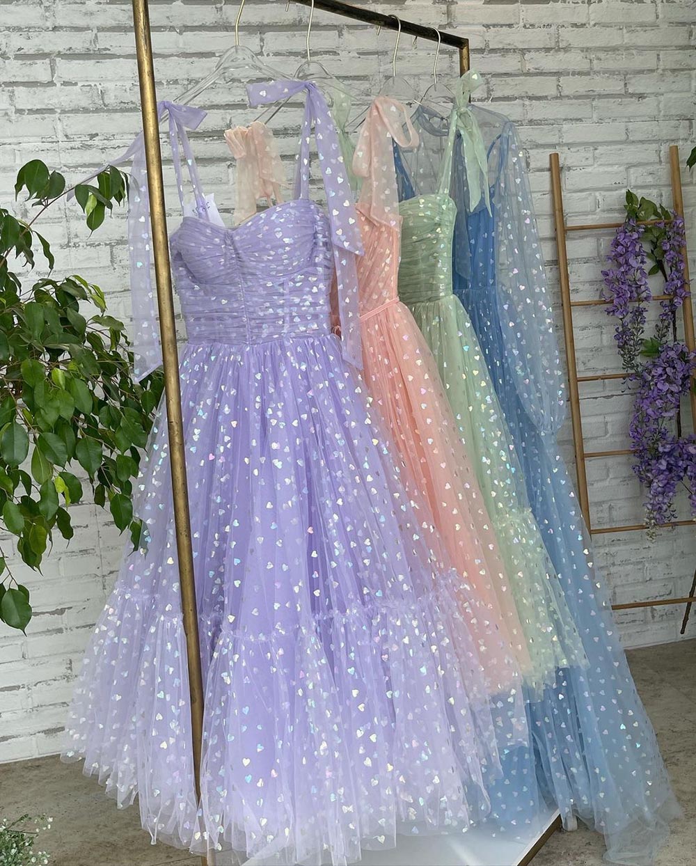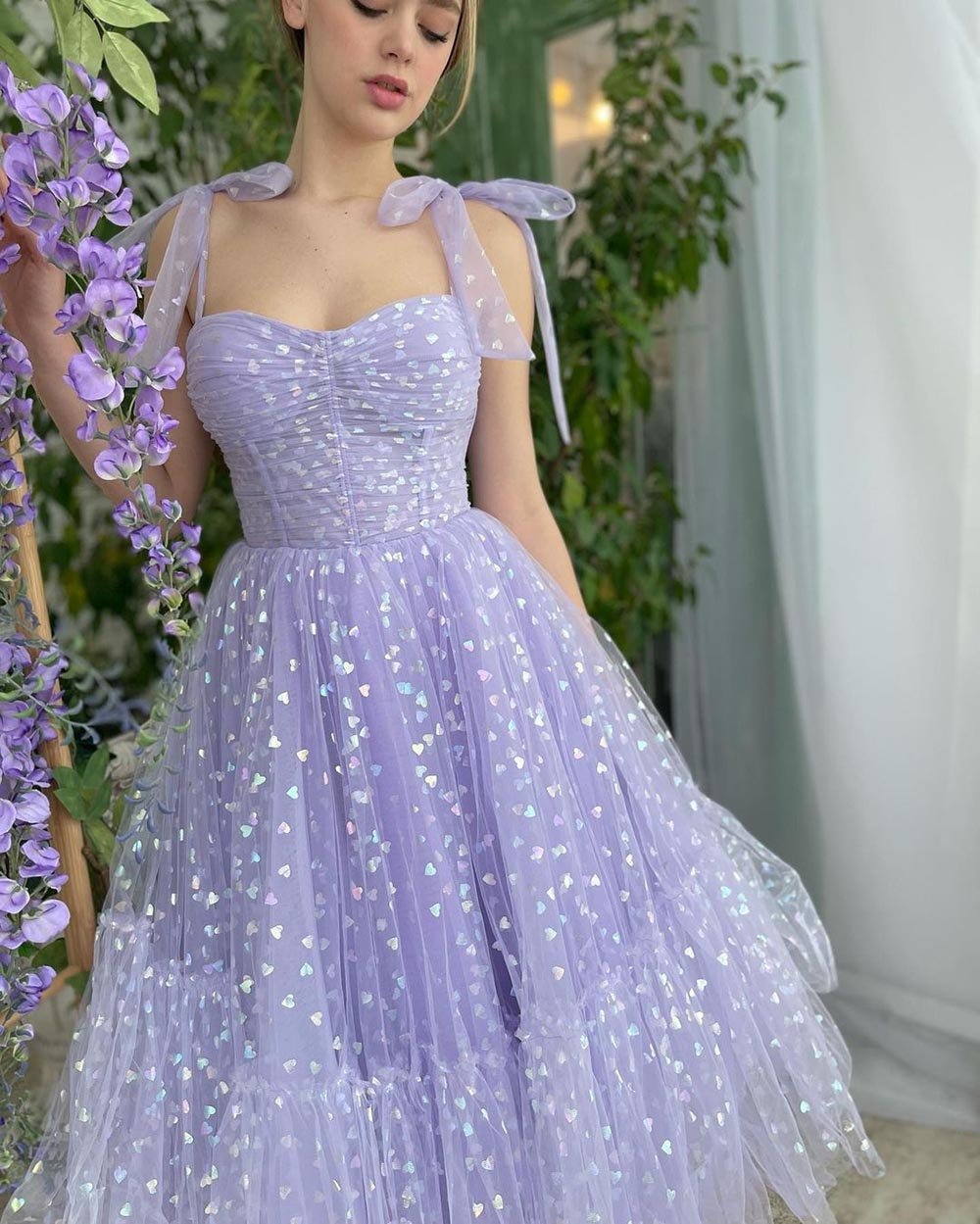 Lavender Hearty Tulle Prom Dresses Sweetheart Spaghetti Straps A-Line Wedding Party Dresses Tea-Length Evening Gown