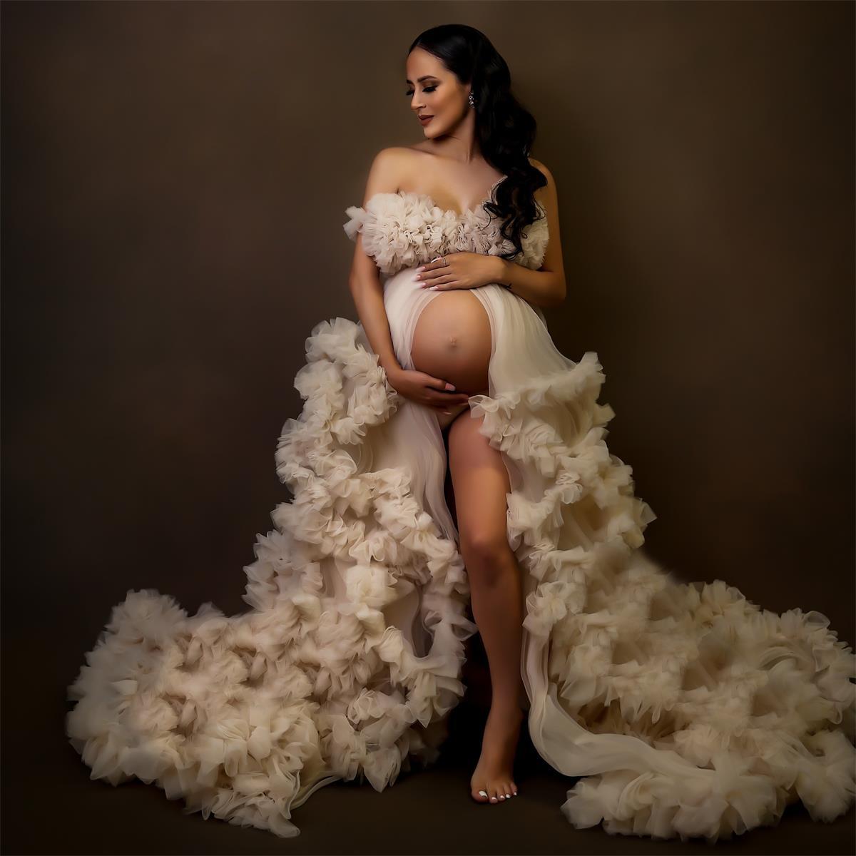 V Neck Ruffles Prom Dresses for Pregnant Women Front Split Evening Dress Maternity Gowns for Photo Shoot