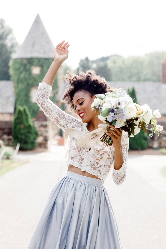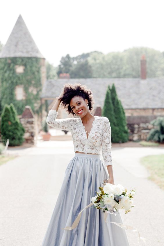 Simple Two Pieces White and Blue Lace Beach Boho Wedding Dress Bridal Dress