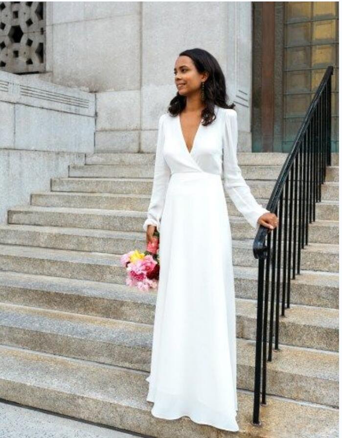 Simple A Line Deep V Neck Long Sleeve Wedding Dress Bridal Dress