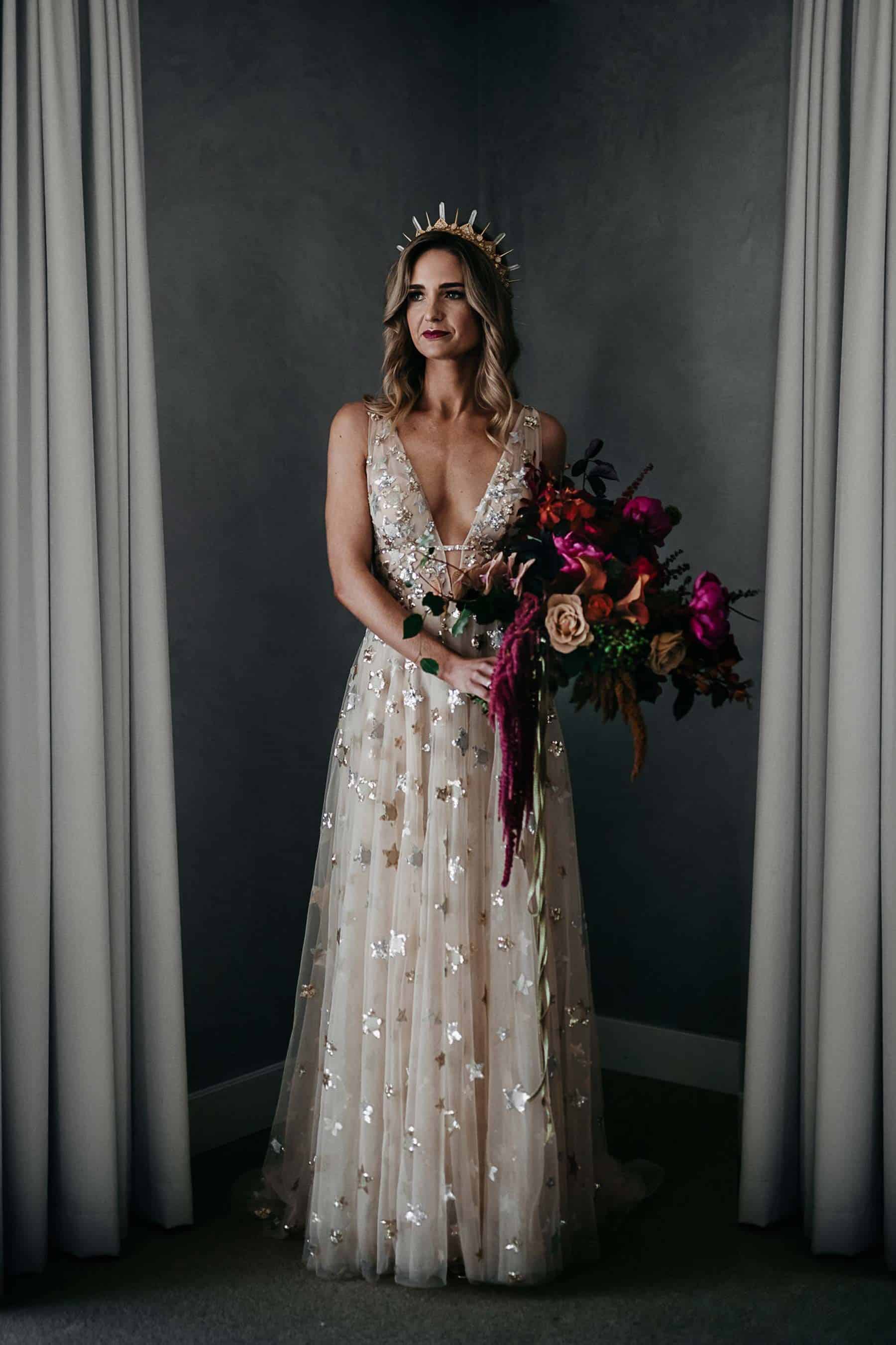 Light Champagne Sexy Deep V Neck Stars Sequins Beach Boho Wedding Dress Bridal Dress
